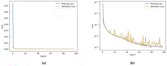 The MLP algorithm was also tested on the bridge model. The model error was 0.000524 and the MLP algorithm also provided a significantly lower error rate. The variations in the RMSE value with the epoch are illustrated in Figure 16a. The plot showed that the model rapidly reached its optimal performance, with the convergence and stabilisation of both training and validation losses. Whilst training, the model experienced early stopping at the 98th epoch; however, it can be clearly seen that the RMSE was not significantly improved after the 10th epoch. To demonstrate a clearer view of the variations in the RMSE value until the early stopping epoch, Figure 16b shows the variations in a logarithmic scale. Even though some fluctuations are observed in the validation dataset, they remain within a relatively low range and, hence, the model is not overfitting significantly. Further, Figure 17 presents the comparison between the predicted data and the actual data for node number 2’s x displacement for 100 testing samples. It demonstrates that both the actual and predicted data are closely similar, indicating a highly effective model performance.