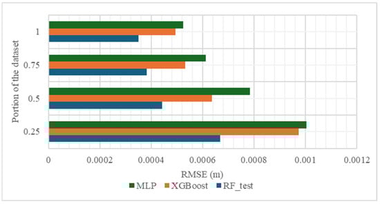 As shown in Table 6, the XGBoost algorithm consistently outperformed the other models, achieving the lowest RMSE values across all error levels, with a minimal increase in the RMSE as the error level rose. This highlights its superior ability to generalise and handle noisy or inaccurate sensor data, which is critical in real-world scenarios where imperfect measurements are common. XGBoost’s gradient-boosting framework and regularisation techniques allow it to prioritise relevant patterns and mitigate the impact of noise effectively, resulting in more stable performance. In contrast, the RF model exhibited a more pronounced increase in the RMSE as the error level increased, indicating a higher sensitivity to inaccuracies in the input data. This could be attributed to RF’s reliance on discrete splits in decision trees, which can amplify the effects of noise. Although RF models are robust to overfitting due to their ensemble nature, they may require additional preprocessing, such as advanced imputation techniques or noise reduction methods, to better handle such scenarios. The MLP algorithm demonstrated moderate robustness, achieving RMSE values slightly higher than XGBoost but exhibiting less sensitivity to increasing error levels compared to RF. The multi-layer architecture and use of non-linear activation functions enable MLP models to learn complex relationships, but they may still be influenced by the quality of input data, necessitating careful tuning and regularisation for optimal performance.