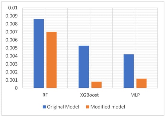 It can be seen that the results have noticeably improved in the RMSE values for the modified models compared to the original ones, particularly for the XGBoost and MLP algorithms. For the XGBoost algorithm, the RMSE value showed a significant decline, demonstrating its robustness and adaptability when dealing with noisy or incomplete datasets. Similarly, the MLP algorithm also exhibited a considerable improvement in accuracy, which can be attributed to its capability to learn and model complex non-linear relationships within the data. In contrast, the RF model experienced a marginal decrease in the RMSE value, improving from approximately 0.009 to 0.007. While this indicates a slight improvement, it highlights the limitations of RF in handling noisy or incomplete datasets compared to XGBoost and MLP. The ensemble-based nature of RF is generally effective for reducing variance and improving predictions, but its reliance on simpler decision trees may make it less adept at capturing intricate patterns in the data. The stark differences in RMSE improvements among the models suggest that both XGBoost and MLP leverage advanced optimisation techniques to mitigate the impact of data imperfections. XGBoost’s gradient-boosting framework, combined with regularisation, enables it to prioritise key features and manage missing values effectively. Similarly, the MLP algorithm, with its multi-layer architecture, benefits from backpropagation and non-linear activation functions, allowing it to refine its weights and enhance predictive accuracy, even with incomplete data.