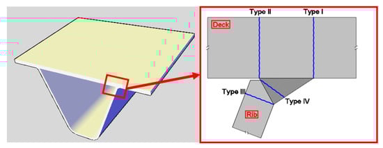 In recent experimental works [5,6,7,8,9], four types of crack as illustrated in Figure 1 have been identified. Fatigue cracks can initiate from the weld toe (Type I) or the weld root (Type II) and propagate into the deck. Cracks were also reported to start at the weld toe from the rib and propagate into the rib (Type III). Cracks can also initiate from the weld root and propagate into the weld (Type IV).