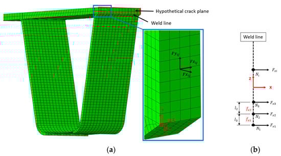 Dong [20] presented a procedure to evaluate the structural stress components based on the extraction of nodal forces along a free body cut at the expected crack plane location. In a displacement-based finite element formulation, the self-equilibrium conditions are automatically satisfied. The efficiency of the approach has been demonstrated by Dong [21,22]. The extraction of nodal forces for Type I cracks is illustrated in Figure 2. The methodology described below can be extrapolated to all four crack mechanisms.