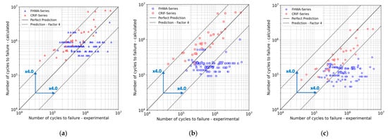 Figure 4a–c show the experimentally obtained and calculated numbers of cycles to failure for both the FHWA and CRIF fatigue test specimens from the nominal stress, hot spot stress, and effective notch stress methods. All safety coefficients and load factors were set to unity in order to facilitate the comparison between the different methods. The fatigue tests conducted by FHWA follow a setup similar to the tests analyzed by Kolstein [5], for which the nominal stress approach provided satisfactory fatigue life predictions.