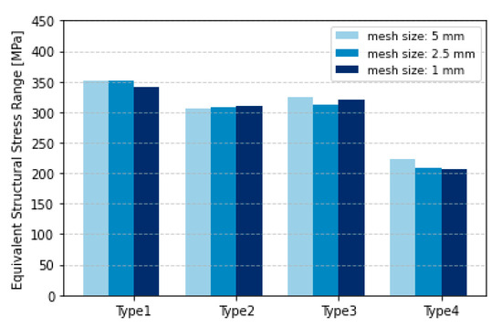 One of the important features of the ESS approach is its mesh-insensitivity. Different mesh sizes have been considered in the case of the first specimen of the SA4 series described in Section 3. It can be seen in Figure 6, that the structural stress range is indeed mesh-insensitive as stated by Dong.