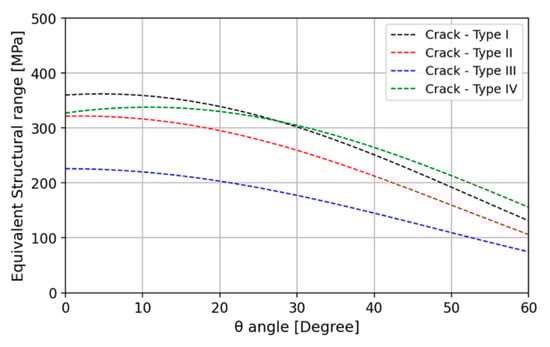 The equivalent structural stress range is calculated for the four potential crack planes forming an angle up to 60 degrees with the reference crack plane for all four crack mechanisms, based on Equations (6)–(8). The equivalent structural stress range is shown in Figure 7 for the different crack types for one selected specimen along different crack plane orientations. The ESS ranges are typically maximum along the reference crack plane orientation, as shown in Figure 1. The maximum ESS range was then retained for fatigue life evaluation.