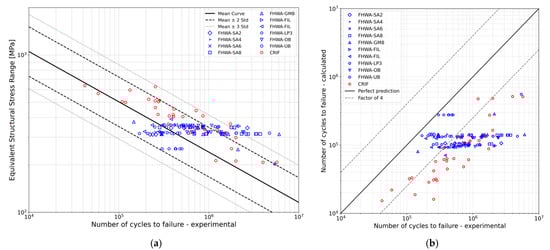 (a) Equivalent structural stress ranges versus number of cycles to failure and (b) fatigue life prediction using the ESS method.