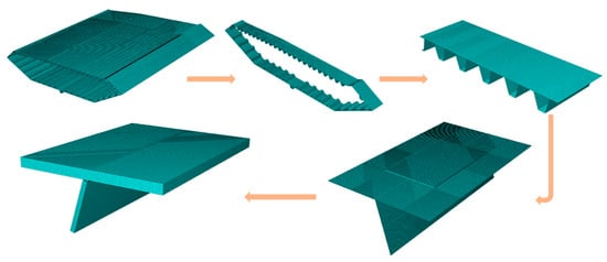 The equivalent line forces (, , and ) in the X-, Y-, and Z-directions, partially shown in Figure 2b, are obtained after conversion of the equivalent nodal forces from Equation (1). The statically equivalent line forces are obtained after the inversion of the transfer matrix T given in Equation (2).