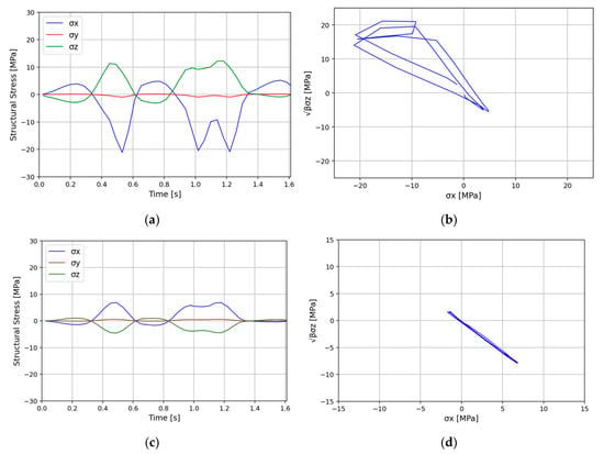 The individual structural stress components , , and were derived using Python scripts to post-process the extracted nodal forces as described in Section 2. As revealed for some selected details in Figure 15a,c, the RD joints experience alternately proportional and non-proportional loading under the action of traffic. Figure 15a shows the time series of the three structural components acting on the Type I crack plane of joint RD52 for a vehicle eccentricity of −0.3 m. Figure 15b shows the time series mapped in the (,) plane where the non-proportionality of the stress state becomes apparent. It also becomes clear that the RD joints undergo biaxial stress states dominated by the and components. The joint RD31 experience on a Type III potential crack plane proportional biaxial stress states is shown in Figure 15c,d.