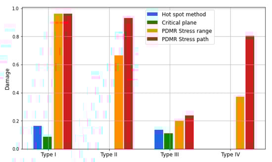 The accumulated damage over the entire design life was calculated based on the nominal and hot spot stress approaches, the critical plane approach, and the PDMR method defined for both the path-independent stress range and the stress path-dependent alternatives.