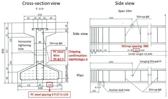 The target sample was a 10.4 m long, 10.1 m wide PC simple pre-tensioned I-girder slab bridge on the west coast of northern Okinawa Island in Japan (hereafter referred to as “K-bridge”). The main girder is illustrated in cross-section and side view in Figure 1 [2]. The PC steel consisted of strands made of two wires of 2.9 mm diameter. The K-bridge was cracked and spalled due to the severe salt damage caused by seawater splashes. Figure 2 indicates the damage on the side of the K-bridge facing the sea. For this analysis, 10 double strands of 2.9 mm dia. were placed in the girder direction on the K-bridge at a covering distance of 30 mm on the underside of the girder, and stirrups of 6 mm dia. were placed at intervals of 380 mm.