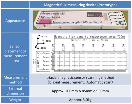 The magnetic flux leakage method uses a magnet to magnetize the steel near the measurement surface and measures the magnetic flux density using a magnetic sensor to detect the location of fractures in the steel [9,15]. The measurement system is shown in Figure 3; triaxial sensors were placed on five parallel lines spaced 40 mm apart, and the magnetic flux density was measured at 10 mm intervals.