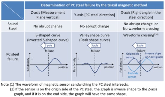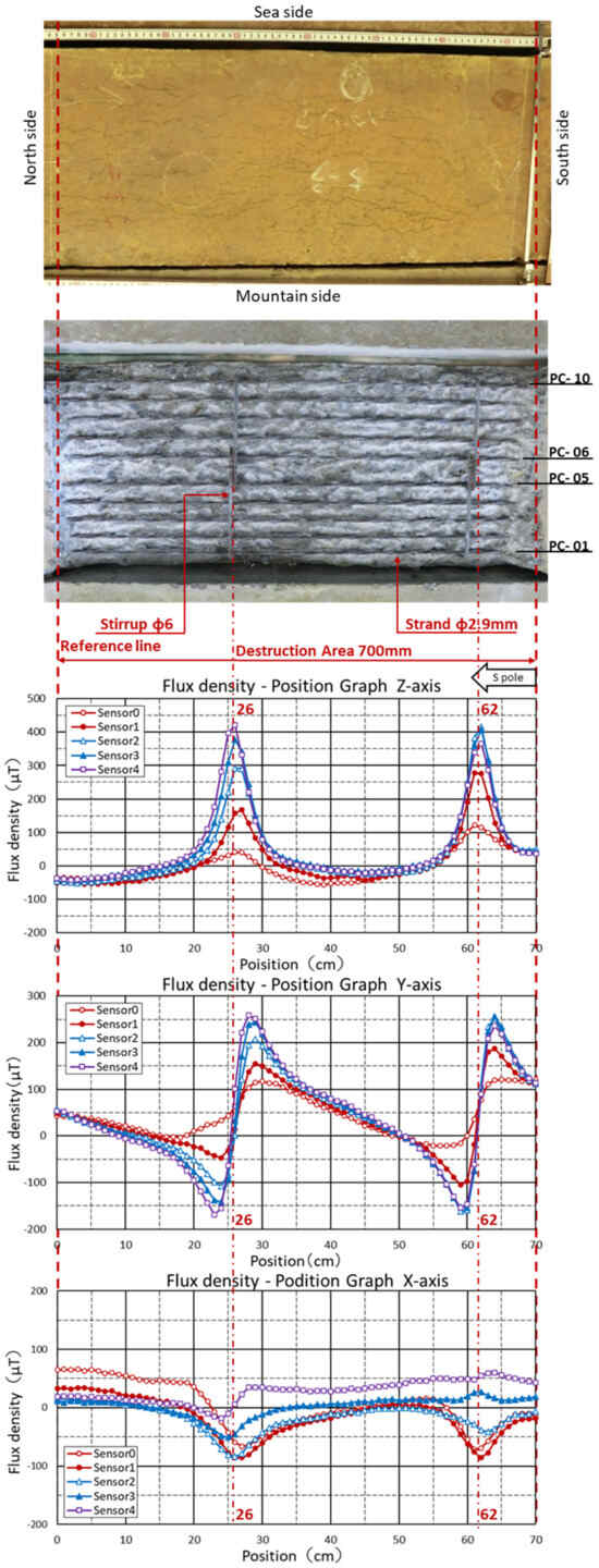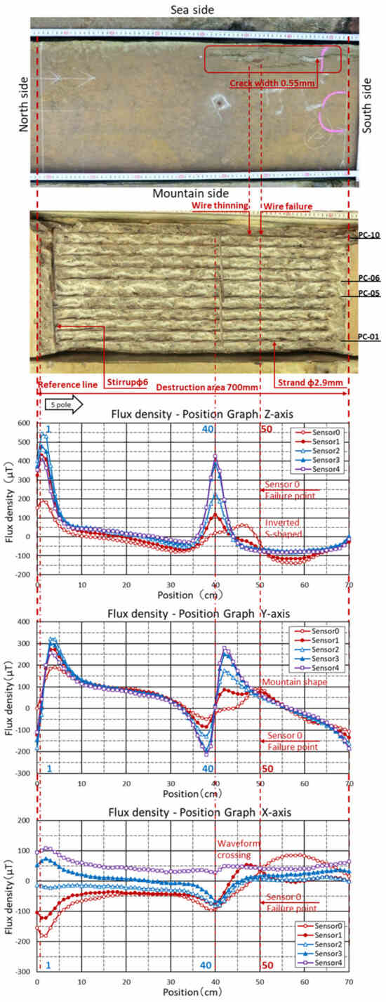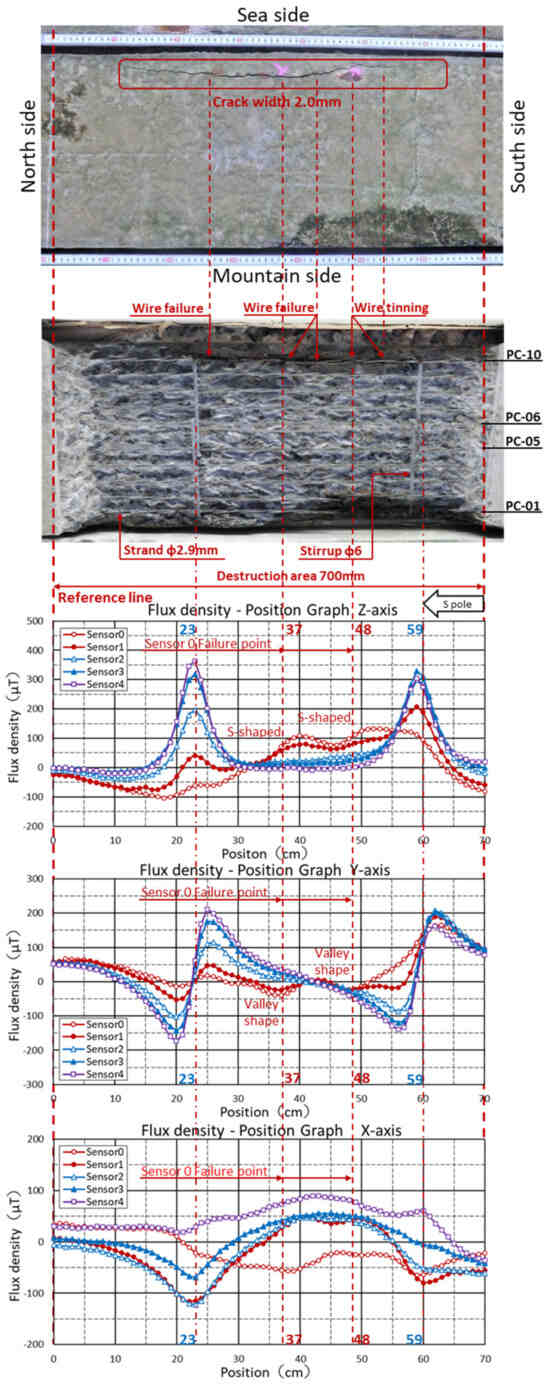 When the direction of magnetization is from left (south) to right (north) in relation to the concrete surface, the Z-axis graph shows an S-shaped waveform with the N pole at the maxima and the S pole at the minima in relation to the fracture point of the PC steel on the magnetic flux density graph obtained via the measuring device whose origin is at the left end. The Y-axis graph shows a minimal (valley) graph shape at the point of the PC steel fracture and a maximal (peak) graph shape when the magnetization direction is reversed. In the X-axis graph, if the magnetic sensor is on the left (sea) side of the broken PC steel, towards the end point of the measuring device, the graph shape is a peak on the N-pole side and a trough on the S-pole side at the point of fracture in the PC steel. If the magnetic sensor is on the right (mountain) side of the PC steel, the graph shape shows a valley on the N-pole side and a peak on the S-pole side at the point of fracture, and the graph shapes of the two magnetic sensors therefore intersect. However, the graphs may not intersect, due to variations in the magnetization of the PC steel and stirrups. For this reason, the graphs in the Z- and Y-axis were checked, and the fractures in the PC steel were measured.