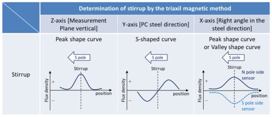 One non-destructive inspection technique for detecting fractures in PC steel is the magnetic flux leakage method. Furthermore, a magnetic flux leakage method using electromagnets (hereafter referred to as the “RM method”) has been investigated and studied for detecting fractures and cross-section losses in concrete due to the corrosion of steel materials [4,5,6,7,8]. The density and regularity of the rebars affect measurements acquired via the RM method. Large electromagnets have been developed to ensure accurate measurement of PC steel behind rebars [9]. In a previous study, a yoke-type magnet (minimum mass 35 kg, length ca. 400 mm) was used to detect single wire failures in tendons with 40 small cross-sections (ca. 20 mm2, e.g., 5 mm diameter (nominal cross-sectional area 19.64 mm2)) with a cover of less than 100 mm and arranged with mild steel reinforcement. A large yoke-type electromagnet (mass approx. 1.5 t, length 3.5 m) was developed, because the tendons behind the rebars were difficult to magnetize when arranged vertically and horizontally near the concrete surface. Excessive amounts of magnetization make it difficult to achieve uniformity of magnetization and increase the influence of rebars and stirrups; so, spacers must be placed on the surface of the model specimen to adjust the distance of the magnetization [10]. Thus, the magnetic flux leakage method is considered to have measurement accuracy issues when rebars or stirrups are placed close to the concrete surface, although detection of ruptures in PC steel in the vicinity of the rebar was not clearly indicated. On the other hand, non-destructive inspection methods using three-axis magnetic sensors have been studied to improve the accuracy of corrosion damage assessment in the steel-bottom plates of steel pipes and tanks in pipelines [11]. Recently, non-destructive inspection using the magnetic flux leakage method employing permanent magnets has been adopted in Japan as an inspection method for detecting corrosion fractures in PC steel at the bottoms and sides of post-tensioned girders [12]. This magnetic flux leakage method uses a magnet to magnetize the steel in the concrete and measure the flux density perpendicular to the concrete measurement plane. Although failure can be detected down to a single strand of bundled PC steel wire or PC steel stranded wire [9,10], the detection of strand fractures in PC steel stranded wire has not been clarified [13].