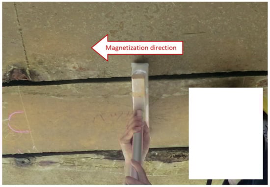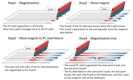 Figure 4 indicates the detection of steel fracture, and Figure 5 shows the detection of stirrups, i.e., steel bars placed around and intersecting the main bars and PC steel to reinforce the shear of the girders. When the S-pole of the magnet is placed at the magnetization start point on the surface of the concrete and moves to the magnetization end point, an S pole is formed at the magnetization start point and an N pole at the magnetization end point above the sound PC steel in the concrete. If the PC steel located in the concrete is fractured, an S pole is formed at the magnetizing start point and an N pole at the magnetizing end point, but an N pole is formed on the steel on the magnetizing start side and an S pole on the magnetizing end side at the point of fracture (see Figure 6). If stirrups are present in the concrete, placing the S pole of the magnet on the concrete surface at the magnetization start point and moving to the magnetization end point will form an N pole on the stirrup that the magnet passes through and an S pole on the stirrup that the magnet does not pass through. Near the magnetized stirrups, the magnetic fields of the PC steel and those on the stirrups overlap [16,17], creating a magnetic field specific to the stirrups.
