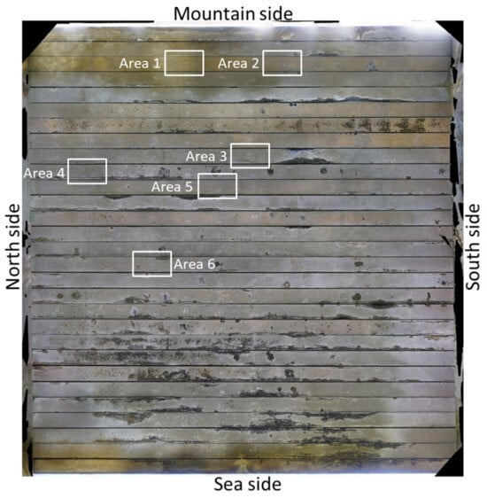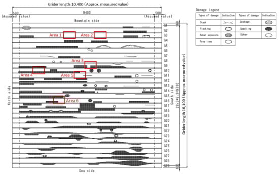 Figure 8 shows the damage map of the bottom of the girder, which was prepared based on the close visual and hammer-tapping investigations conducted on the K-bridge. Figure 9 presents an ortho-image showing the actual damage to the entire bottom of the girder. Figure 8 and Figure 9 indicate the areas of destructive investigation. For this investigation, the following areas were selected from among the many damaged areas: sound area, area with crack width of about 0.4 mm, area with crack width of about 0.55 mm, area with crack width of about 2.0 mm, area with crack width of about 2.5 mm, area with crack width of about 4.0 mm, and area with crack width of about 5.0 to 6.0 mm. The area numbers were assigned in order starting from the mountain side.