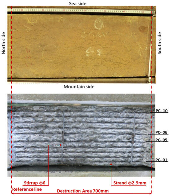 The destructive depth was about 40 mm, which was enough to confirm the entire circumference of the first volume of PC steel from the bottom of the girder. The results of these investigations were used to identify the locations of corrosion failure and cross-sectional defects in the PC steel after destructive investigation.