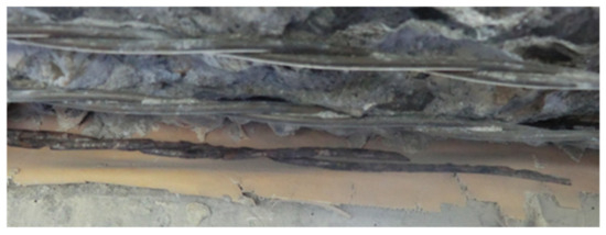 Figure 12 and Figure 13 show the bottom of the girder before and after destruction, and the triaxial magnetic waveform of a corrosion crack with a width of 0.55 mm. Cracks were observed on the bottom of the girder in the direction of the girder, starting around 370 mm from the reference line and extending beyond the investigation area, within 20 to 30 mm from the edge of the girder on the seaward side. The maximum crack width was about 0.55 mm, and a crack length of about 180 mm was observed about 40 to 50 mm from the edge of the girder on the seaward side, starting at about 450 mm from the reference line. In between the two cracks, there was a rusty layer about 30 mm long and 10 mm wide. Failure of a single wire (hereafter referred to as a “wire failure”) and a cross-sectional defect of about half of the wire (hereafter referred to as “wire thinning”) were observed on the two-wire strand (hereafter referred to as the “strand”) at the same position as the corrosion crack with a width of 0.55 mm (Figure 14). Except for in the PC steel immediately below the cracks, there was no fracturing or thinning of the strands due to corrosion.