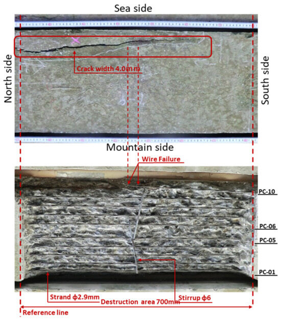 In this study, the results of destructive and nondestructive investigations into PC steel material failure were analyzed to determine the accuracy of the magnetic flux leakage method for detailed detection of fractures and cross-sectional defects in PC steel. The tests were conducted on a pre-tensioned I-girder exposed to a severe salt environment on the coast for about 40 years. The main conclusions of this study are as follows: