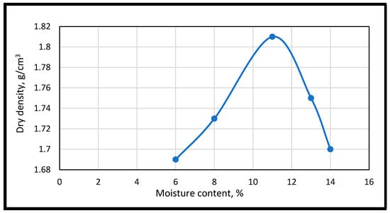 The clay subgrade soil was the same as that existing in the Airport of Al-Muthanaa region in Baghdad. Table 3 illustrates the clay properties of subgrade soil. Figure 1 shows the compaction curve. Based on the Atterberg limits (LL = 32%, PL = 21%), Table 3, and grain size distribution, the subgrade soil can be classified as a low-plasticity clay (CL) according to the Unified Soil Classification System (USCS).