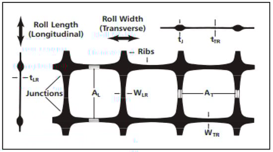 The reinforcement used in this study is the Biaxial Geogrid BX1100 (G1), manufactured by Tensar International (see Figure 2 and Figure 3). This geogrid is made from polypropylene and features a rectangular rib structure. The key properties are summarized in Table 4.