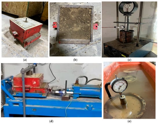 Experimental procedure stages: (a) compaction of clay-WFS mixture in the mold; (b) prepared sample in shear box before geogrid placement; (c) large-scale direct shear test setup with instrumentation; (d) CBR test under vertical loading; (e) soaked CBR test with dial gauge for deformation measurement.