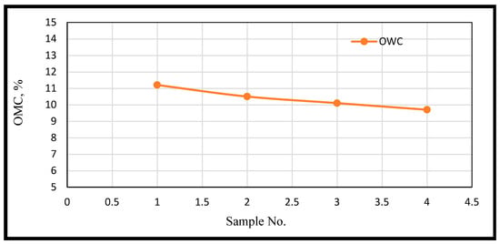 Clay subgrade soil samples were examined to determine the MDD and OMC using the Modified Proctor Test, with varying percentages of WFS (0%, 5%, 10%, and 15%). The results are illustrated in Figure 6 and Figure 7.