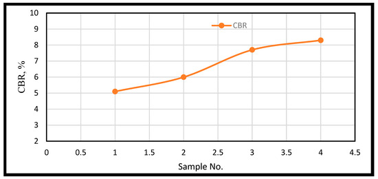 The CBR test results, as shown in Figure 8, indicate a clear increase in bearing capacity with the addition of WFS up to 10%, after which the rate of improvement becomes marginal. This plateau suggests a threshold in the effectiveness of WFS as a stabilizer, potentially due to oversaturation of the soil matrix or reduced interaction between WFS particles and clay minerals at higher contents. Such behavior underscores the importance of identifying optimal dosages for soil amendments. Similar to the approach proposed by Xu et al. [], although in a different context, parameter optimization plays a critical role in achieving efficient and economical soil improvement. Their methodology, focused on testing a range of variables under controlled conditions, supports the notion that beyond a certain point, additional stabilizer may not yield proportionally greater benefits.