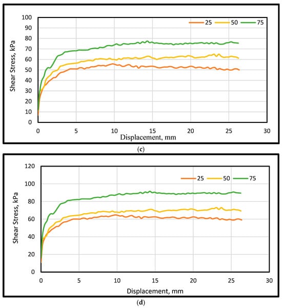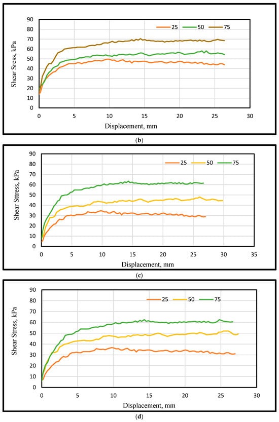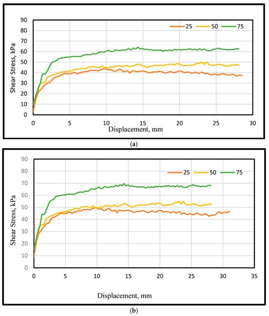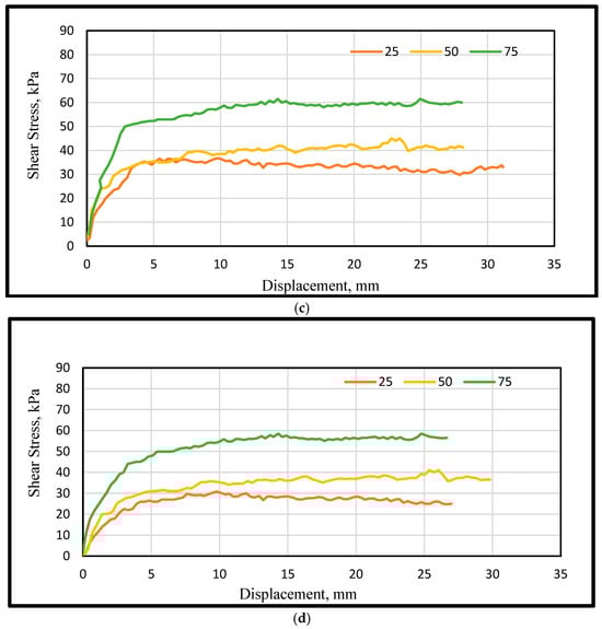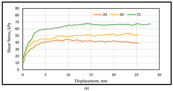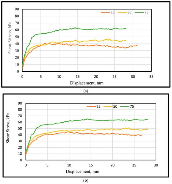 The ASTM D3080 [] states that at least a 10% horizontal displacement of the box size should be used to shear the specimen, where this would be equal to 20 mm. Youwai et al. [] found that shear stress can be determined either by taking the peak shear stress value at the end of the test. According to ASTM D5321/D5321M-14 [], the horizontal displacement may reach 75 mm or any other value specified by the operator, and the test may be concluded once the maximum shear stress is reached. The failure criteria used in this study are based on the peak shear stress.