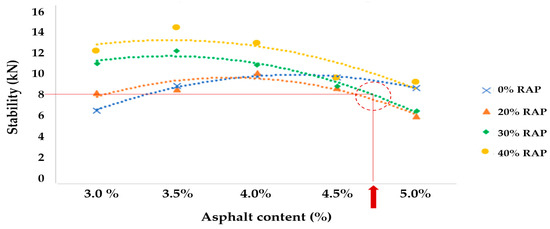 The deformation also increased as the replacement content of recycled asphalt pavement (RAP) in the mixture increased; however, the deformation should not exceed 4 mm according to ASTM D6927-15 [40]. It is observed at the intersection highlighted within the circle, which shows the 4.75% asphalt content indicated by the arrow, along with the millimeters of flow reached by the mixture with 30% RAP. This limit is intended to ensure that the asphalt mixture has adequate stiffness and resistance to permanent deformation under load. The specification prevents excessive deformation, which could indicate an unsuitable mixture for use in pavements. Therefore, this parameter defines the optimal RAP content as 30% for an AC-20 asphalt content of 4.75%, with a stability of 8.0 kN and a flow of 3.8 mm [Figure 6].