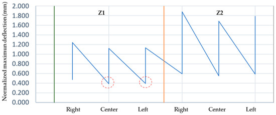 Referring to N∙CSV∙ CAR∙1∙03∙010/17 [41], which is related to the determination of the deflection of an SICT pavement, the values for Z1-LEFT and Z1-CENTER were determined for a normalized load level equal to 400 kPa and homogeneous zones with a deflection of less than 0.40 mm.