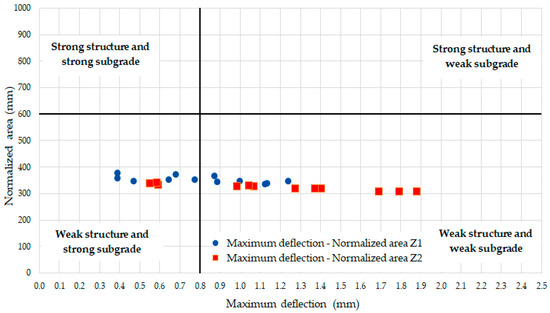 The normalized area represents half of a section of the deflection basin, extending from the axis that passes through the point of impact to a vertical line located 900 mm from this point [Scheme 3]. Together with the maximum deflection, this area serves as an indicator of the pavement and subgrade’s resistance [47]. Consequently, the structural condition of the pavement in both models, identified as Z1 and Z2, was assessed by correlating the maximum deflection with the normalized area [Figure 10].