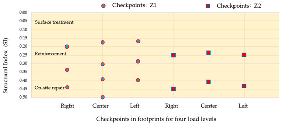 Structural index at control points of each footprint for 4 load levels.