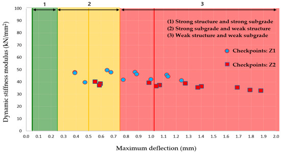 The dispersion illustrates all values from both control points for Z1 and Z2, and it is again noted that a higher number of values from the Z1 footprint are observed at performance level 2 of the pavement compared to the values from the Z2 footprint. It is evident that the structure, even when classified as weak, creates a gap between control points and, in turn, between the model footprints. The deflections for Z1 tend to be lower in comparison to Z2, despite some stiff values being similar. This suggests that Z1 is more structurally efficient in resisting loads compared to Z2.