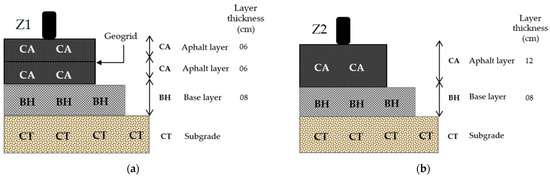 The study was conducted in the experimental area of the postgraduate building at the Faculty of Construction and Habitat Engineering of Veracruz University. Two variants of the RAP–geogrid system, referred to as Z1 and Z2, were implemented [Scheme 1]. Full-scale tests allowed for finite element analysis of the effect of rolling loads on small slabs of the same applied mix [32]. Each variant was constructed using a standardized test structure with a surface area of one square meter, which covers physical access and guarantees the rolling of both tires of the vehicle axles that enter. The Z1 structure featured a 12 cm thick layer of AC-20 hot mix asphalt pavement containing 30% recycled asphalt pavement (RAP) and a fiberglass geogrid with a 5 mm by 5 mm configuration positioned at the center of the layer (a). In contrast, the Z2 structure consisted of a 12 cm thick AC-20 hot mix asphalt pavement layer that also contained 30% RAP, identified as AC-20/30R, but without any geogrid reinforcement (b). Both structures were placed on a layer of well-graded gravel with a maximum nominal size of 0.75 mm, forming an 8 cm thick hydraulic base that was compacted to 95% ASTM D1883-21 [33] and situated on pre-consolidated soil throughout the duration of the paver’s service before low-speed traffic usage.