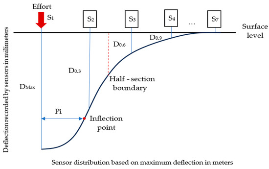 The evaluation of pavements is based on the inflection point of the deflection basin, as illustrated in Scheme 3. The ratio of the maximum deflection (Dmax) to the horizontal distance from the inflection point (Pi) generated for a load level allows the calculation of the structural index (SI). Variations in these parameters create different conditions within the layers of the pavement structure, leading to various potential solutions for rehabilitating the pavement [49].