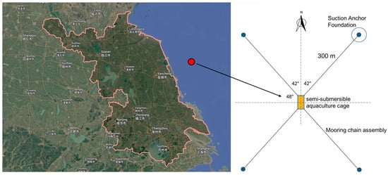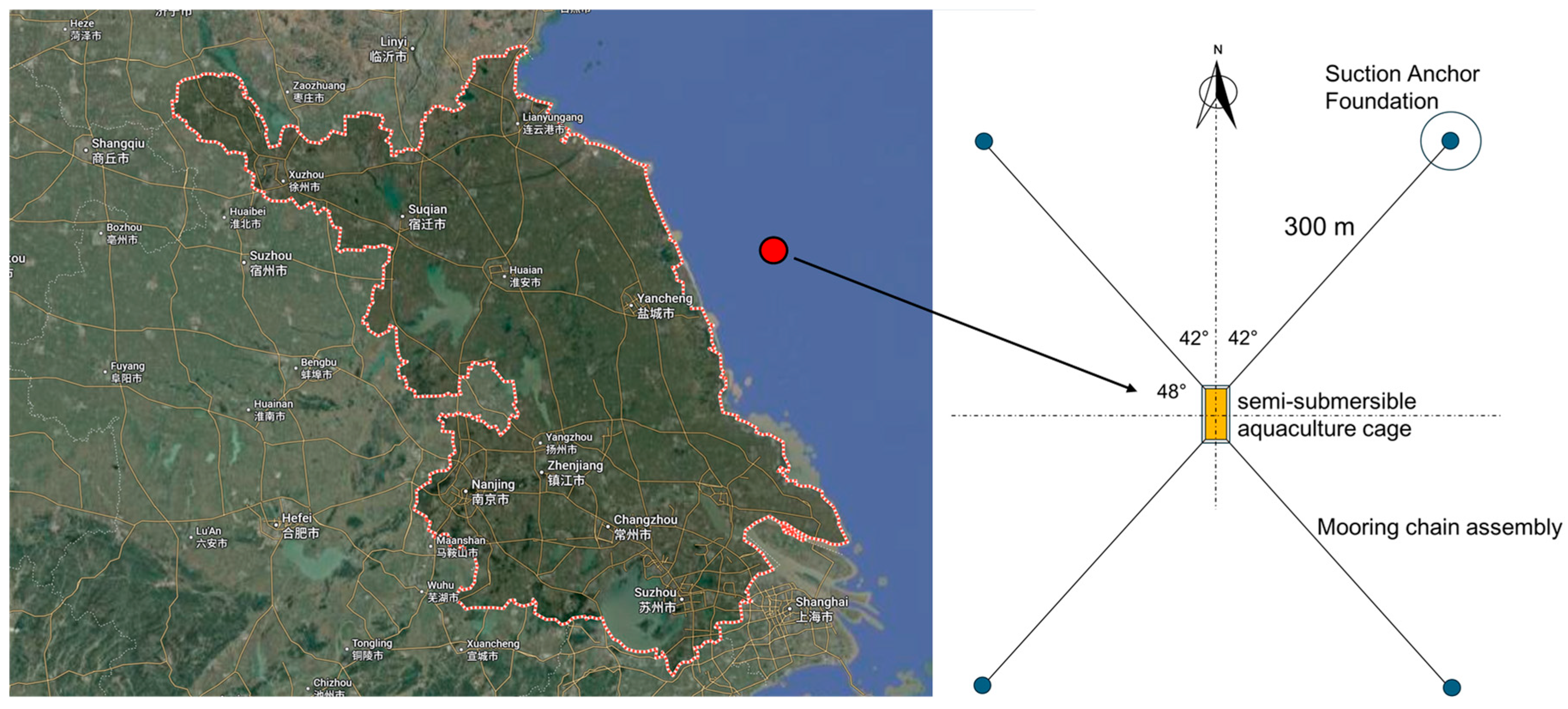 The semi-submersible aquaculture platform in this study used a four-point mooring configuration, consisting of four identical suction anchor foundations labeled sequentially from one to four in a clockwise arrangement. Each suction anchor features a cylindrical design with a diameter of 12 m, length of 11 m, a sidewall thickness of 25 mm, and top plate thickness of 26 mm. The mooring pad-eye is positioned 7.5 m below the anchor top along the external surface. The mooring system maintains a horizontal projection of 300 m between the platform and anchor pad-eyes, with a total cable length of 313 m (excluding installation fittings). All suction anchor foundations were designed and fabricated by Power China HuaDong Engineering Co., Ltd., specializing in offshore wind power and floating foundation manufacturing, located in Hangzhou City, Zhejiang Province, China. Detailed schematics of the anchor foundation layout and dimensional specifications are presented in Figure 2.