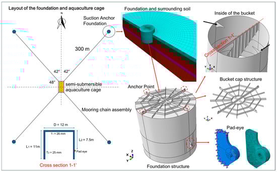 Layout of the aquaculture cage and modeling of the suction anchor foundation.