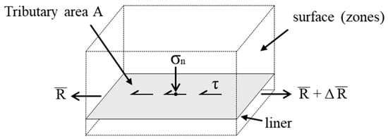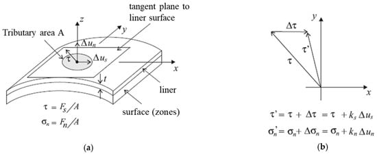 Idealization of interface behavior at a liner node. (a) Shear stress, τ, and incremental relative shear and normal displacements, Δus and Δun, between liner and surface; (b) shear and normal stress update at each time step.