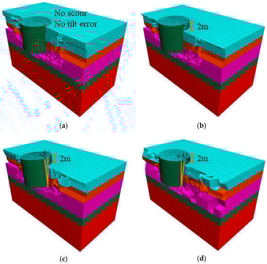 3D modeling of foundation and surrounding soils under different scouring and tilt error conditions. (a) Foundation under 0 m scour condition; (b) foundation under 2 m scour condition; (c) foundation with 2 m scour and −5° tilt error; (d) foundation with 2 m scour and +5° tilt error.