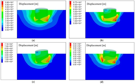 Deformation of surrounding soils under different conditions based on numerical simulations for 10-year ULS conditions (safety factor 2.0): (a) 0 m scour, causing backward tilting with 5.0 cm pad-eye and 5.67 cm soil displacements, respectively; (b) 2 m scour, amplifying displacements to 7.5 cm (pad-eye) and 8.78 cm (soil); (c) 2 m scour with a −5° tilt error, resulting in displacements of 6.5 cm (pad-eye) and 7.18 cm (soil); (d) 2 m scour with a +5° tilt error, resulting in displacements of 9.1 cm (pad-eye) and 9.94 cm (soil).