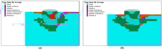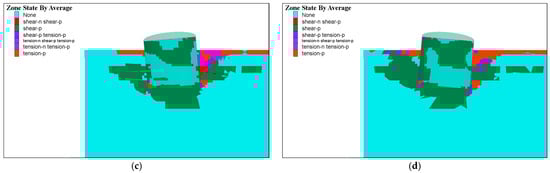 Plastic zones in surrounding soils under varying conditions from numerical simulations with 10-year ULS loading (safety factor 2.0), illustrating progressive expansion: (a) foundation under 0 m scour condition; (b) foundation under 2 m scour condition; (c) foundation with 2 m scour and −5° tilt error; (d) foundation with 2 m scour and +5° tilt error.