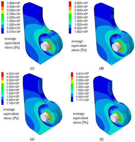 Equivalent stress distributions in the pad-eye under uniform loading (17,089.6 kN tension at a 22.20° initial angle) from solid-element simulations (25 mm mesh, 20,552 elements) with fixed edge constraints: (a) Case 1–1 (0° tilt, 0° directional error); (b) Case 1–2 (0° tilt, 75° directional); (c) Case 2–1 ( +5° tilt, 0° directional); (d) Case 2–2 ( +5° tilt, 7.5° directional); (e) Case 3–1 (−5° tilt, 0° directional); (f) Case 3–2 (−5° tilt, 7.5° directional). All cases show stresses below the 319.5 MPa allowable limit after CCS averaging, confirming compliance with DNV/CCS standards even under installation tolerances.