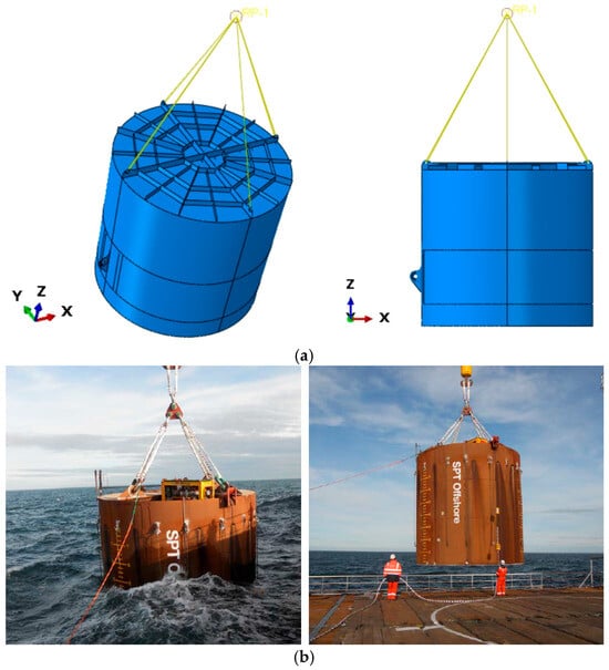 The suction anchor is lifted using a four-point arrangement, with slings inclined at 60° to the top cover. The lifting lugs are integrated with the main beams of the top cover and designed as trunnion-type pad-eyes, as shown in Figure 10a. A similar on-site lifting configuration is illustrated in Figure 10b.