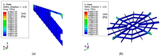 Equivalent stress distributions in the suction anchor structure under hoisting loads (combined lifting factor 1.7875, fixed constraints at lifting points) from finite element analysis: (a) internal bucket structure (max. 67.89 MPa in stiffeners); (b) top bucket structure (max. 82.05 MPa in cover stiffeners). All components, including the main bucket (46.38 MPa), remain well below the 319.82 MPa allowable limit, confirming compliance with design and regulatory standards.