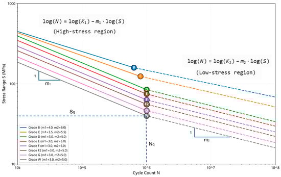The stress range S and corresponding number of cycles Ni are determined using S–N curves. This study employs a bilinear S–N curve (Figure 12), with the following governing equations: