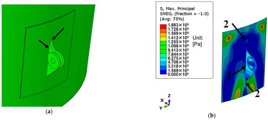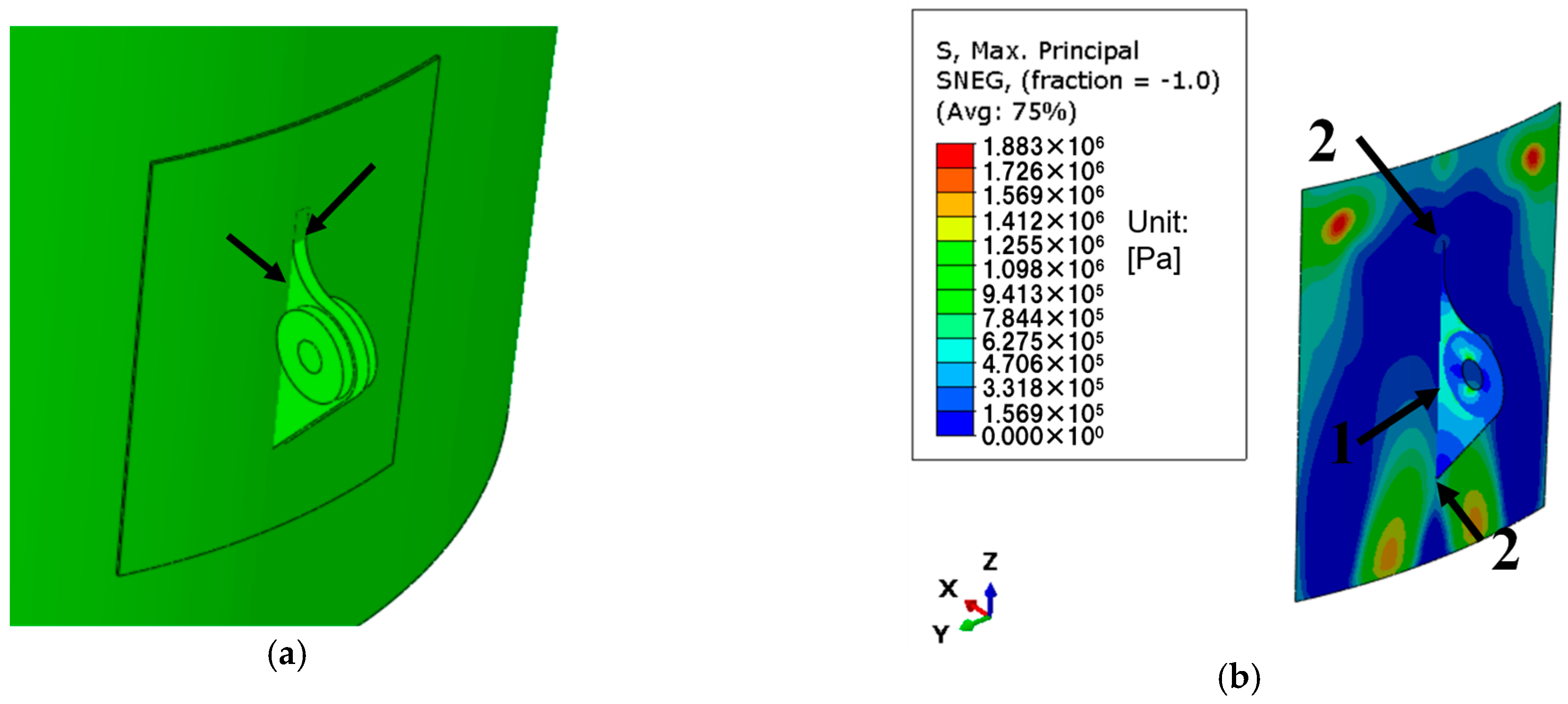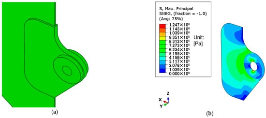 Figure 13. Principal stress of the pad-eye structure under fatigue loading conditions: (a) 3D model of pad-eye; (b) fatigue analysis of pad-eye.
