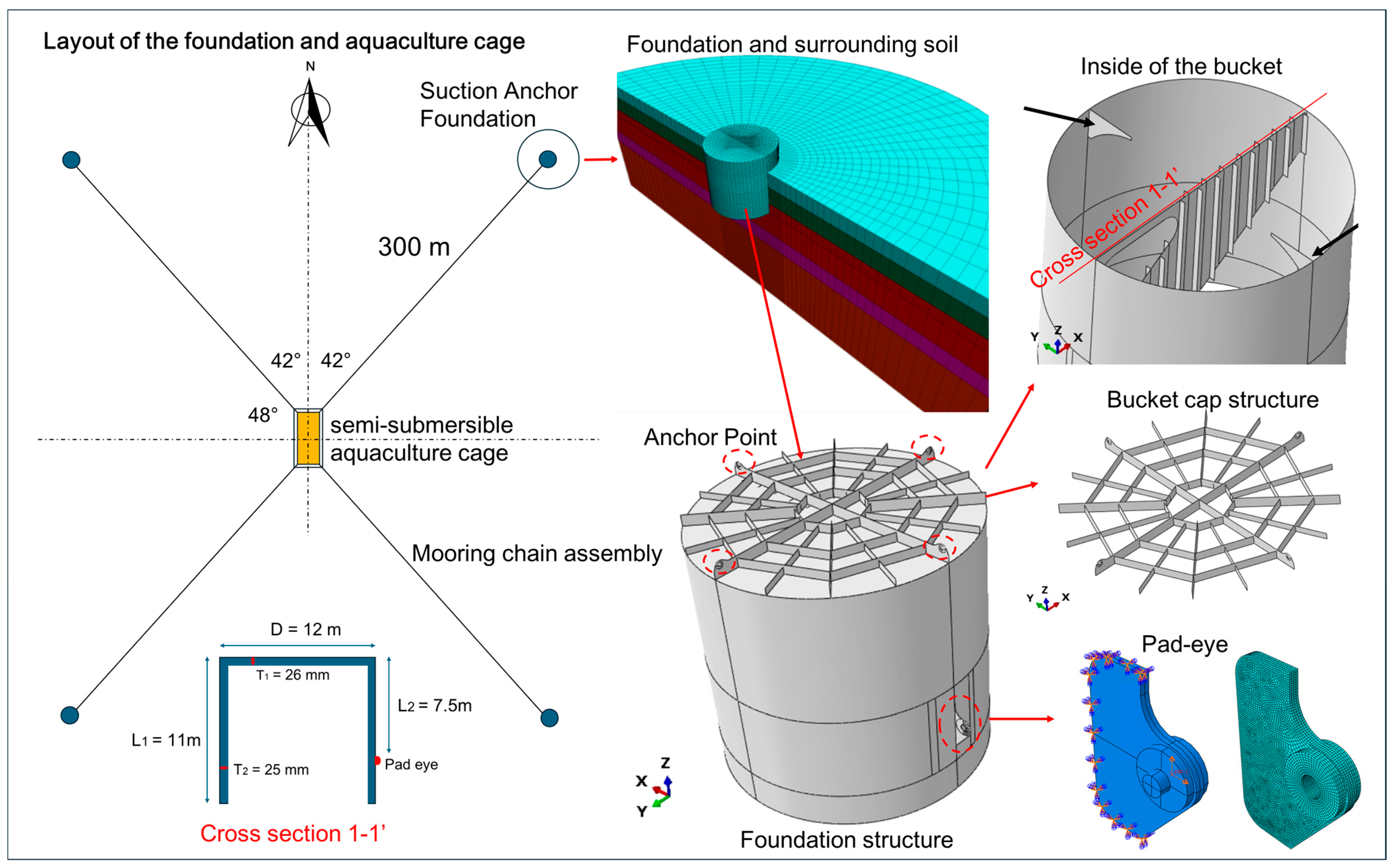 Figure 2. Layout of the aquaculture cage and modeling of the suction anchor foundation.