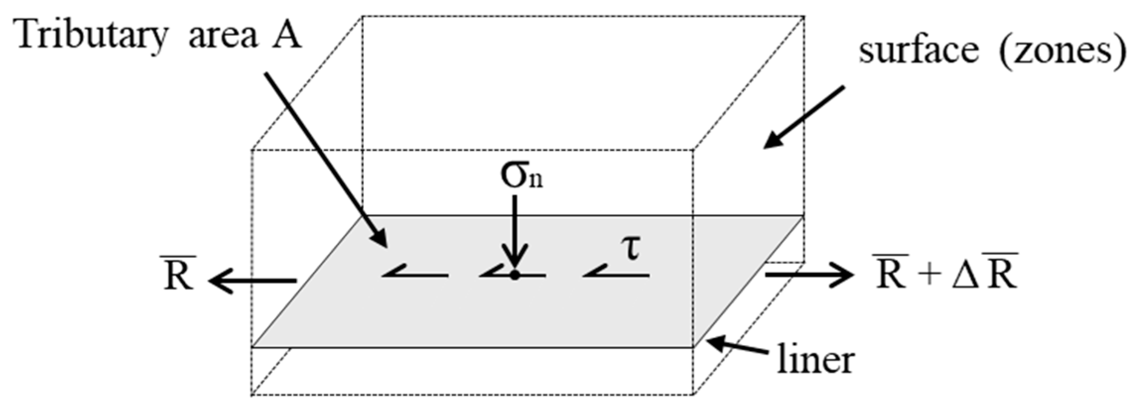 Figure 4. Idealization of interface behavior at a liner node. (a) Shear stress, τ, and incremental relative shear and normal displacements, Δus and Δun, between liner and surface; (b) shear and normal stress update at each time step.