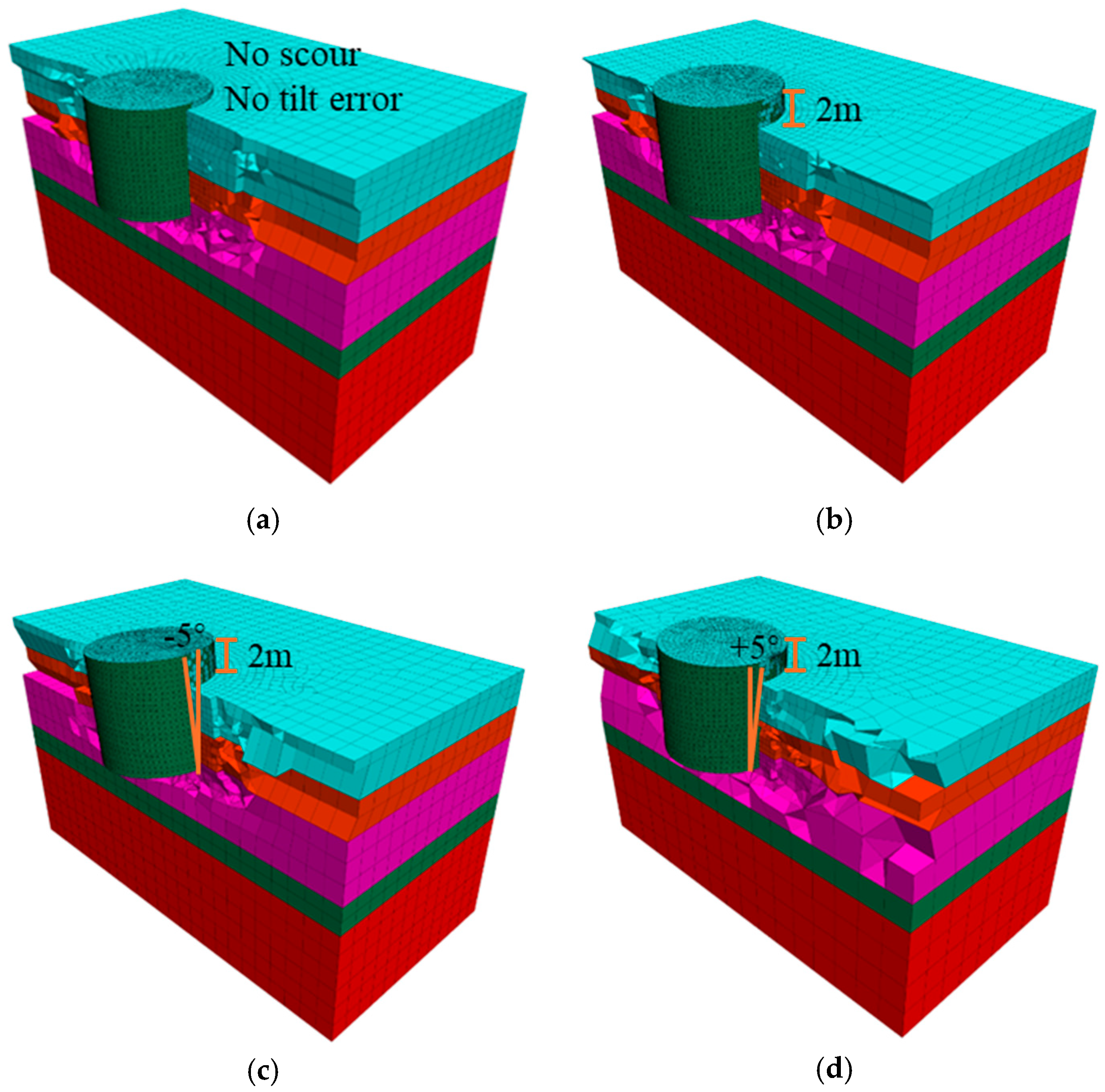 Figure 5. 3D modeling of foundation and surrounding soils under different scouring and tilt error conditions. (a) Foundation under 0 m scour condition; (b) foundation under 2 m scour condition; (c) foundation with 2 m scour and −5° tilt error; (d) foundation with 2 m scour and +5° tilt error.