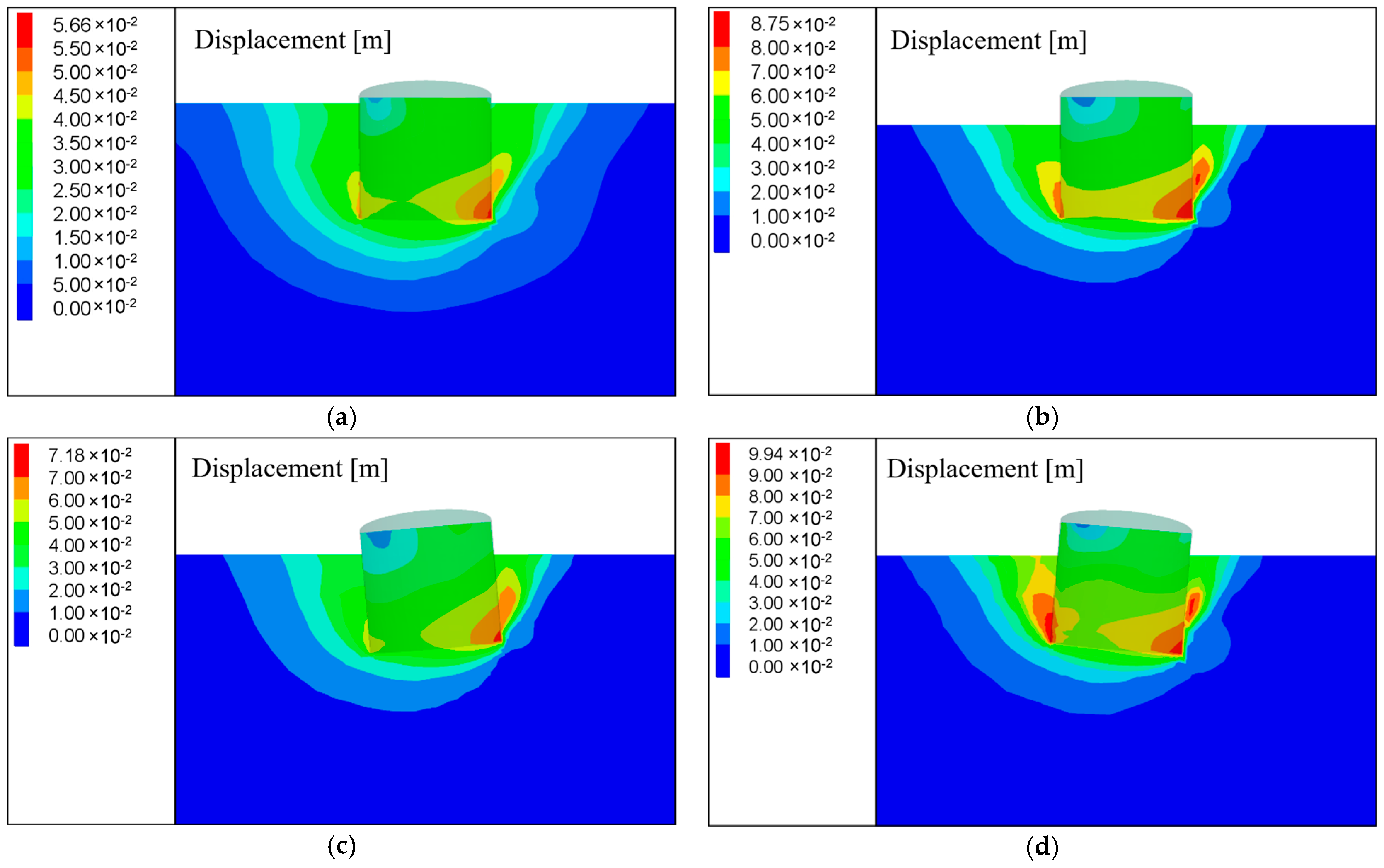 Figure 6. Deformation of surrounding soils under different conditions based on numerical simulations for 10-year ULS conditions (safety factor 2.0): (a) 0 m scour, causing backward tilting with 5.0 cm pad-eye and 5.67 cm soil displacements, respectively; (b) 2 m scour, amplifying displacements to 7.5 cm (pad-eye) and 8.78 cm (soil); (c) 2 m scour with a −5° tilt error, resulting in displacements of 6.5 cm (pad-eye) and 7.18 cm (soil); (d) 2 m scour with a +5° tilt error, resulting in displacements of 9.1 cm (pad-eye) and 9.94 cm (soil).