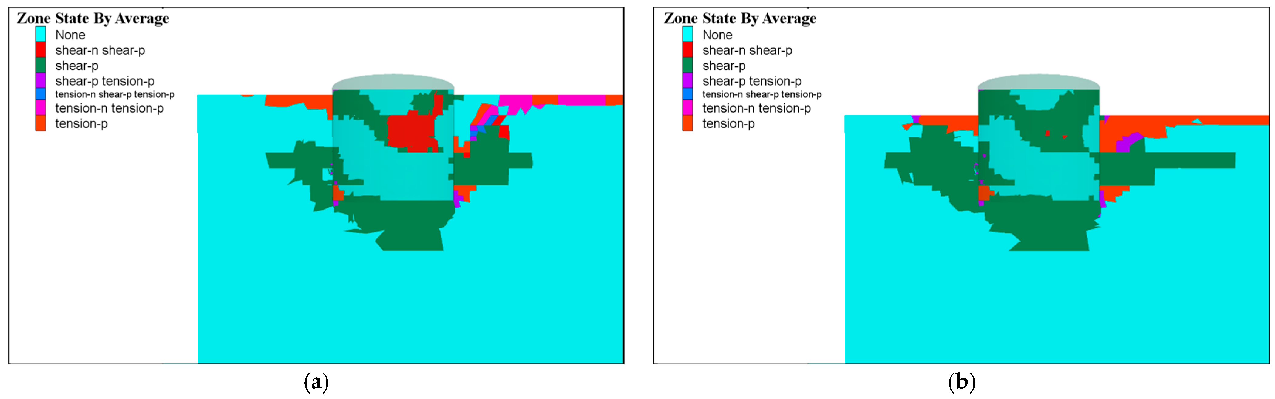 Building on the 2 m scour condition, ±5° tilt errors were analyzed. Forward tilt (−5°), shown in Figure 6c, reduces displacements (6.5 cm pad-eye, 7.18 cm soil) compared to vertical installation, while backward tilt (+5°), shown in Figure 6d, exacerbates deformations (9.1 cm pad-eye, 9.94 cm soil) with pronounced plastic zones. This establishes backward tilt as the governing unfavorable scenario, demonstrating 26% higher displacements than the no-tilt case.